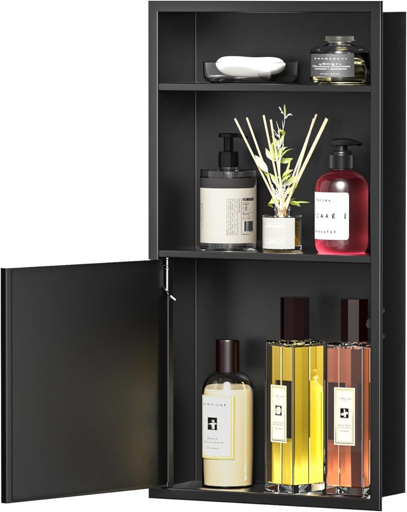 The recessed design allows efficient use of wall space, helping maintain a clean and organized environment. With a combination of open and concealed shelving, users can store both essential items and decorative accessories.