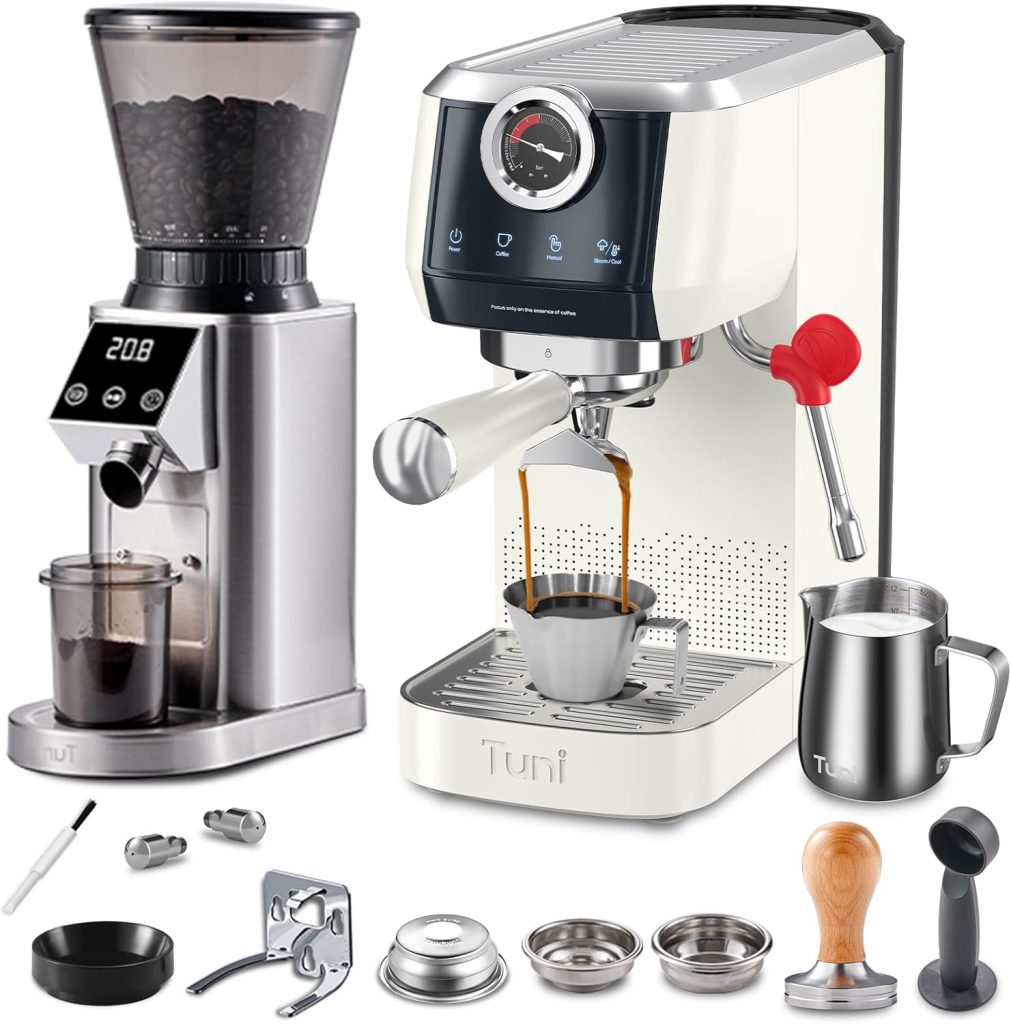 The Tuni E2 Espresso Machine and G1 Silver Conical Burr Grinder Combo is a powerful, feature-rich system designed for serious coffee enthusiasts. Its combination of professional-grade brewing components, precision grinding, and advanced control features makes it one of the most versatile options in its category.