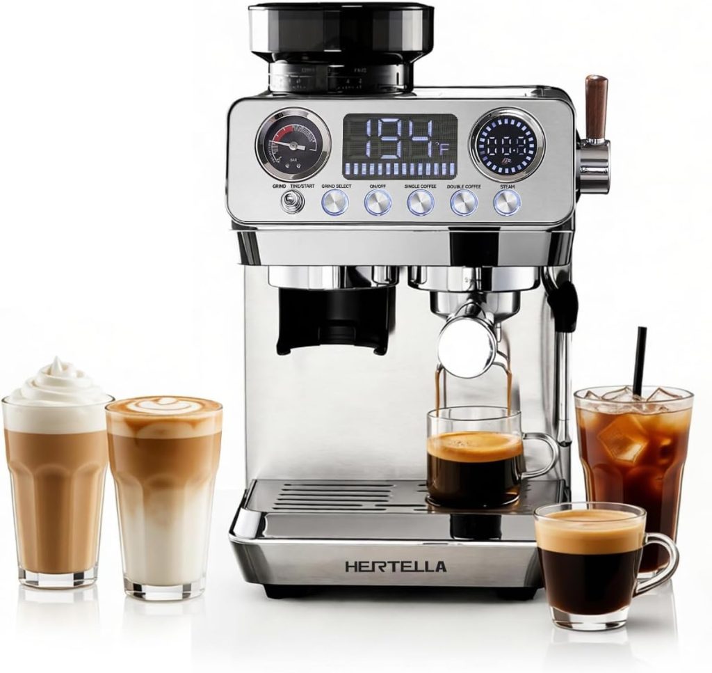 The HERTELLA Espresso Machine with Burr Grinder is a feature-rich, high-performance coffee maker designed for users who appreciate quality and customization. Its combination of precision grinding, advanced temperature control, and dual brewing modes makes it a standout choice in the home espresso market.