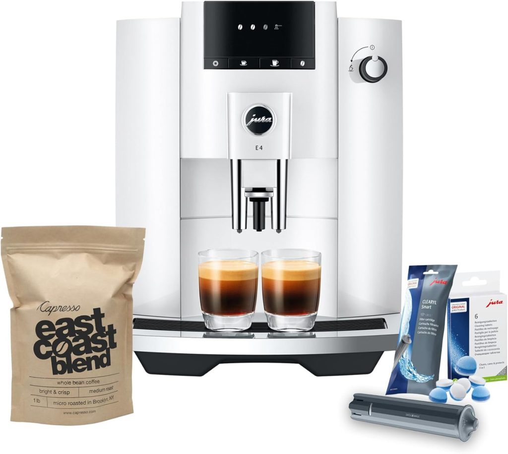 The bundle includes essential accessories that enhance performance and maintenance efficiency, making it a comprehensive solution for coffee lovers seeking reliability and convenience. With its Professional Aroma Grinder, advanced brewing unit, CLEARYL Smart+ filtration system, and 3-phase cleaning tablets, the Jura E4 offers a complete coffee preparation experience in one package.