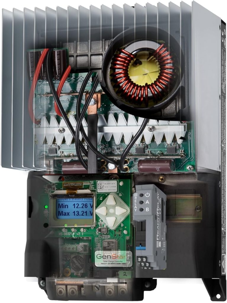 The GenStar uses passive cooling through its heavy-duty aluminum body rather than fans. This eliminates one of the most common points of failure in charge controllers.