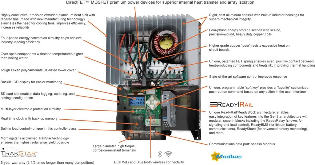 The Morningstar GenStar 100A MPPT Solar Charge Controller with Meter (GS-MPPT-100M-200V) is one of the most advanced solar charge controllers available. Its high efficiency, advanced protections, modular expansion capabilities, and rugged US-engineered design place it in a premium class of professional-grade solar hardware.