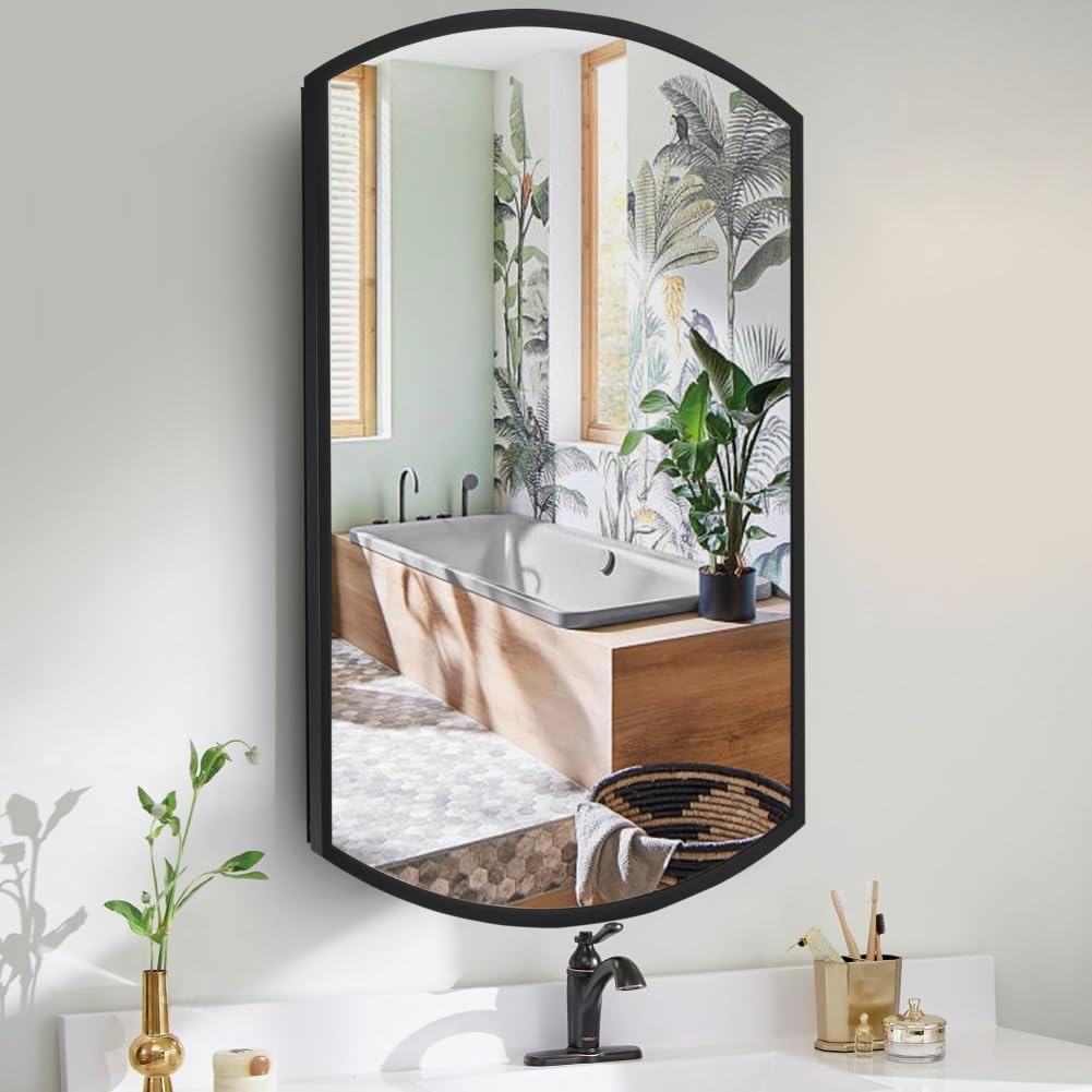 The Movo Oval Aluminum Medicine Mirror Cabinet 16″ W x 26″ H Black Framed Farmhouse Medicine Cabinet with Mirrored Door, Recess or Wall Mount Bathroom Mirrored Cabinet, Adjustable Glass Shelves offers a refined combination of modern farmhouse style and functional storage. Designed to enhance bathroom organization while elevating interior decor, this cabinet provides a practical solution for keeping toiletries, grooming tools, and daily essentials neatly arranged.
