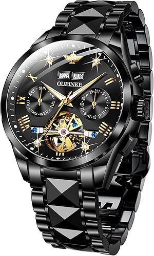 The OUPINKE Mens Automatic Watches Diamond Skeleton Self Winding Luxury Dress Wrist Watch Sapphire Crystal Tungsten Steel delivers an impressive blend of style, craftsmanship, and functionality. Its skeleton dial, diamond accents, and moon phase complication make it a standout piece in its category.