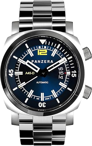 The Panzera Aquamarine 45D is a high-performance diver’s watch built for serious use. With a water resistance rating of 300 meters, it is suitable for professional diving activities. At the same time, its polished stainless steel construction and classic design make it versatile enough for formal and casual occasions.