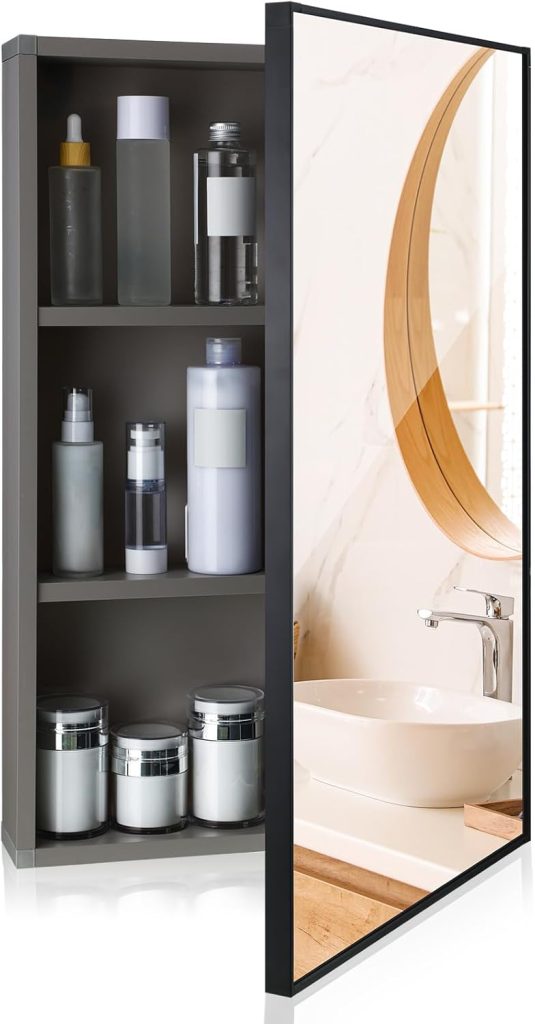 The Suzile Modern 16 x 24 x 4.3 Inch Medicine Cabinet with Mirror Wall Mounted Framed Recessed Bathroom 3 Shelves Wall Mounted Sliding Doors (Light Grey, 1 Pack) offers a reliable combination of storage functionality and modern design.