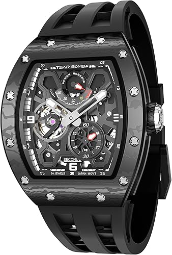 The TSAR BOMBA Luxury Automatic Watch is a bold and innovative timepiece that combines modern materials with traditional watchmaking techniques. Its carbon fiber and ceramic construction, Japanese automatic movement, and practical features make it a standout choice.