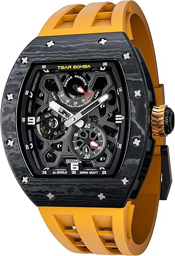 The TSAR BOMBA Skeleton Automatic Mechanical Watch is a bold and innovative timepiece that combines modern design with reliable performance. Its tonneau case, skeleton dial, and high-quality materials make it a standout option.